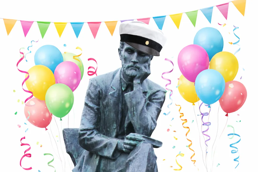 Aleksis Kiven patsas saa vapun kunniaksi ylioppilaslakin koko perheen tilaisuudessa Nurmijärven kirkonkylällä keskiviikkona 30.4. klo 17.30 alkaen.
