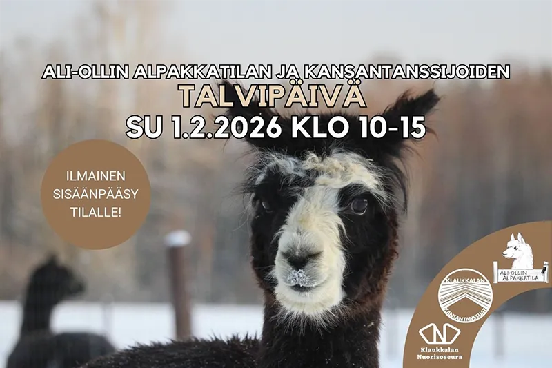 Ali-Ollin Alpakkatila ja Klaukkalan kansantanssijat kutsuvat koko perheen viettämään perinteistä talvipäivää sunnuntaina 1.2.2026 klo 10–15. Päivän aikana tilalla nautitaan talvisesta tunnelmasta, eläinten seurasta ja monipuolisesta ohjelmasta eri-ikäisille. Sisäänpääsy tapahtumaan on maksuton, ja aktiviteetteihin osallistutaan erillisillä aktiviteettilipuilla.